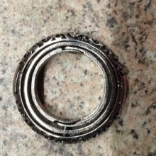 I really like this ring in concept. The various rings that open at different angles make a really cool accessory. I find myself taking it off to play with it often.The other day I noticed that the bit of discoloration that I'd noticed earlier on the inner layers was actually around a hole. A hole that should have a pin in it securing these rings to the outer ring. So now the two inner rings are attached to the outer one by only one pin, opposite where the other should be. I suspect it's only a matter of time before the other pin fails too.