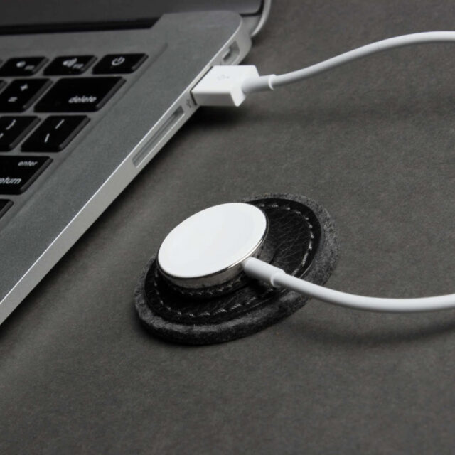 A luxurious home for your Apple Watch Provide your Apple Watch with a home on your desk with the luxurious Apple Watch Pad. Rich black pebbled leather is formed in a raised circle shape with contrast color stitching. No more unintentional scratches Simultaneously protect your desk and your Watch Magnetically…