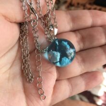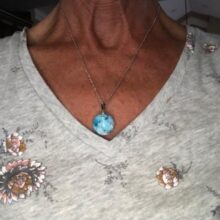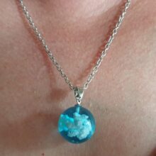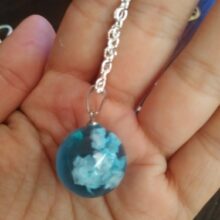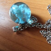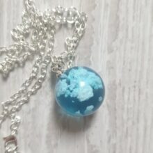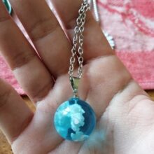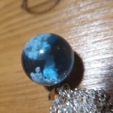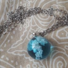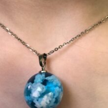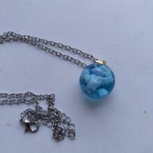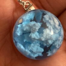 I wasnt sure what to expect, however, this Blue Sky Cloud Resin Necklace is a pretty piece of casual costume jewelry. It might not go with a cocktail dress but it looks cute with jeans. The resin globe is about 3/4 of an inch round. Reminds me of a gum ball. You can see the cloud formations are different through out the pendant and I am sure each one is unique and no two are the same.A few areas on mine the white cloud is seen on the edge, not the blue resin. The chain is about 18-20 inches in overall length. Its not fancy, just a casual piece of costume jewelry that is cute. Its priced less than $20. It comes in a nice manilla colored box to give as a gift.