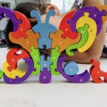 Letters come colorfully alive with Butterfly A to Z Puzzle game for toddlers by BeginAgain! Each wooden puzzle piece is a part of the complete alphabet in the shape of a butterfly, with a lowercase letter on one side, and the uppercase one on the other. It’s nothing but high-flying fun with this ABC puzzle! Learning the alphabet gets so easy!