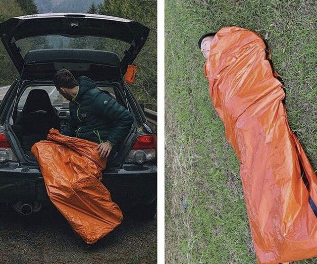 In the most dire of situations, the vivid orange color of our Emergency Sleeping Bag can act as an emergency signal to rescue crew in the air. You can use the bag to form a visible 79 x 35.5 in (L x W) signal to anyone to see. This sleeping bag is an absolute necessity for camping and outdoor adventures: it not only keeps you warm at night as a sleeping space and protected from extreme elements, but can save your life in life-rescue situations and emergencies.