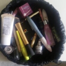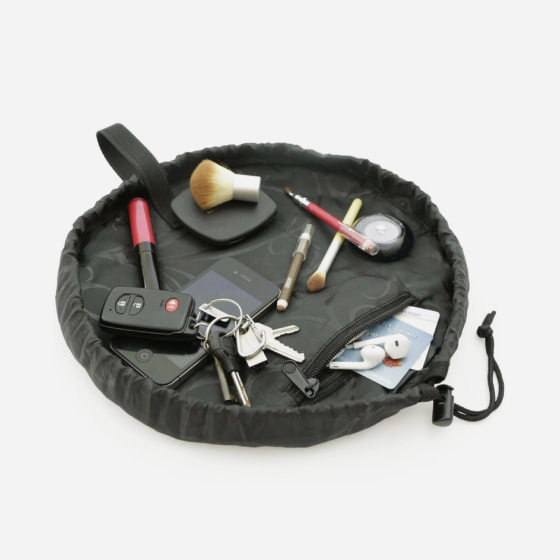 I had previously bought the larger version , and loved it except for the fact that the silver lining would get dirty all the time, now I don't have that problem with this one plus it is more compact to suit my needs and I don't have to pick up all my makeup just pull the cord and its all in the bag again, it does saves you time