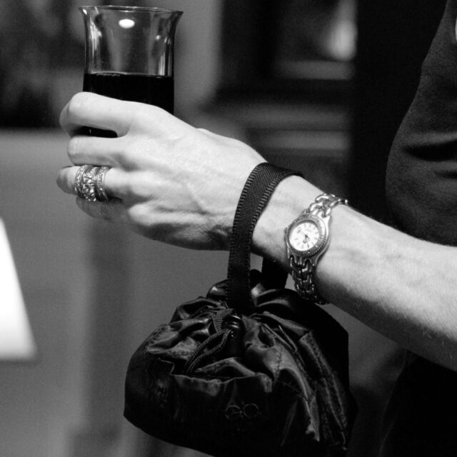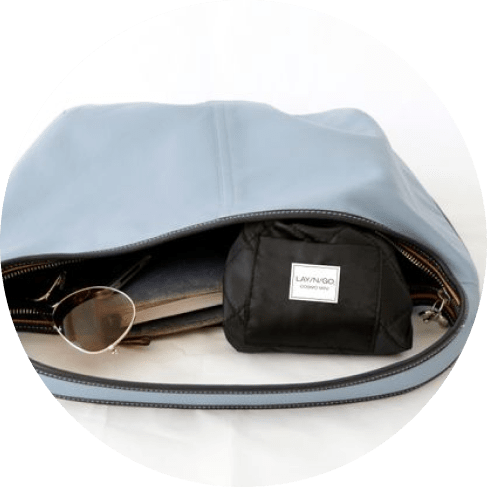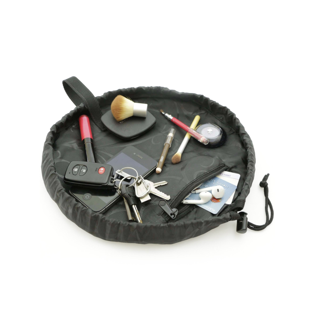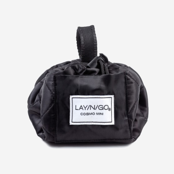 Cute mini version of the original Lay-N-Go Cosmetic Bag. It has all the features of its big sister: Zippered interior pocket, drawstring closure and open outside pocket (which I use to tuck away the drawstring when carrying it in my purse). The black Mini also features a black-on-black graphic design on the inside to spruce it up. It is definitely considerably smaller than the original version, meaning that it does not hold as many items. I would not use this for travel to hold all of my makeup items, it is much more suited for a purse and just those items one cannot live without during the day. Please see my uploaded picture for a size comparison between the Mini and the Original Cosmetic Bag.