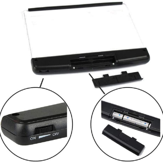 Plastic screen, odorless, batteries need to be bought separately. Convenient for reading. I`m fully satisfied with this purchase!