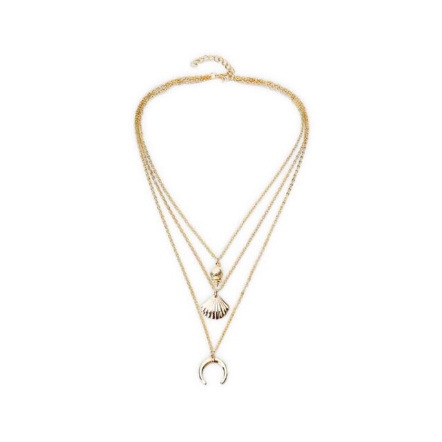 Number of layers: 3. Length: 18 in. + 2.6 in., 20 in. + 2.6 in., 22.2 in. + 2.6 in. Pendants: seashels and moon. Color: gold-toned. Weight: 0.8 oz. Material: alloy.