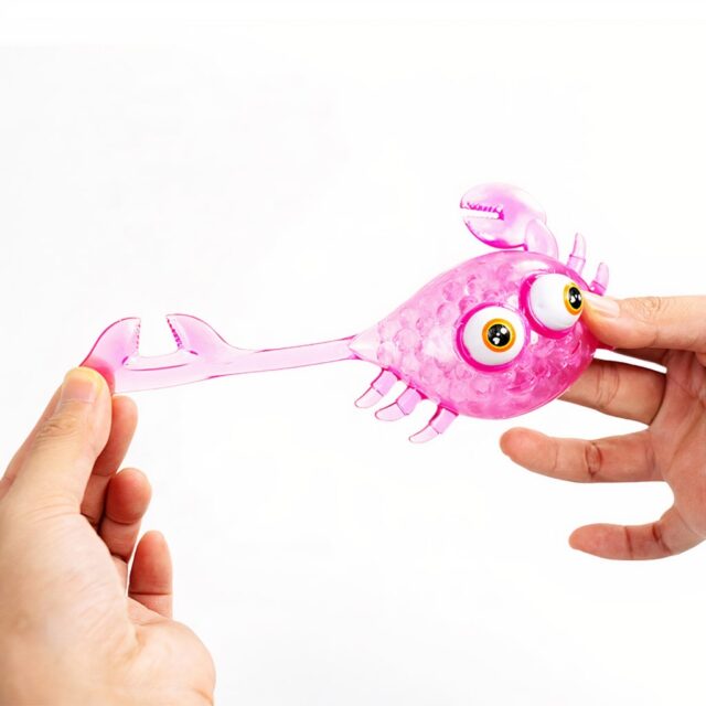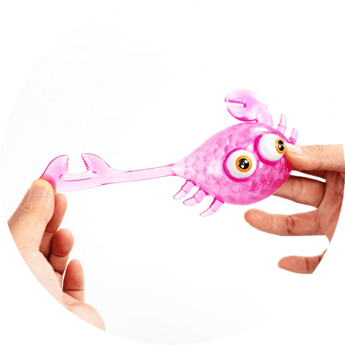 The toy is stretchy and filled with transparent EPS beads. When it gets squeezed, it deforms and the beads move around it. The toy can endure a lot of enthusiasm!